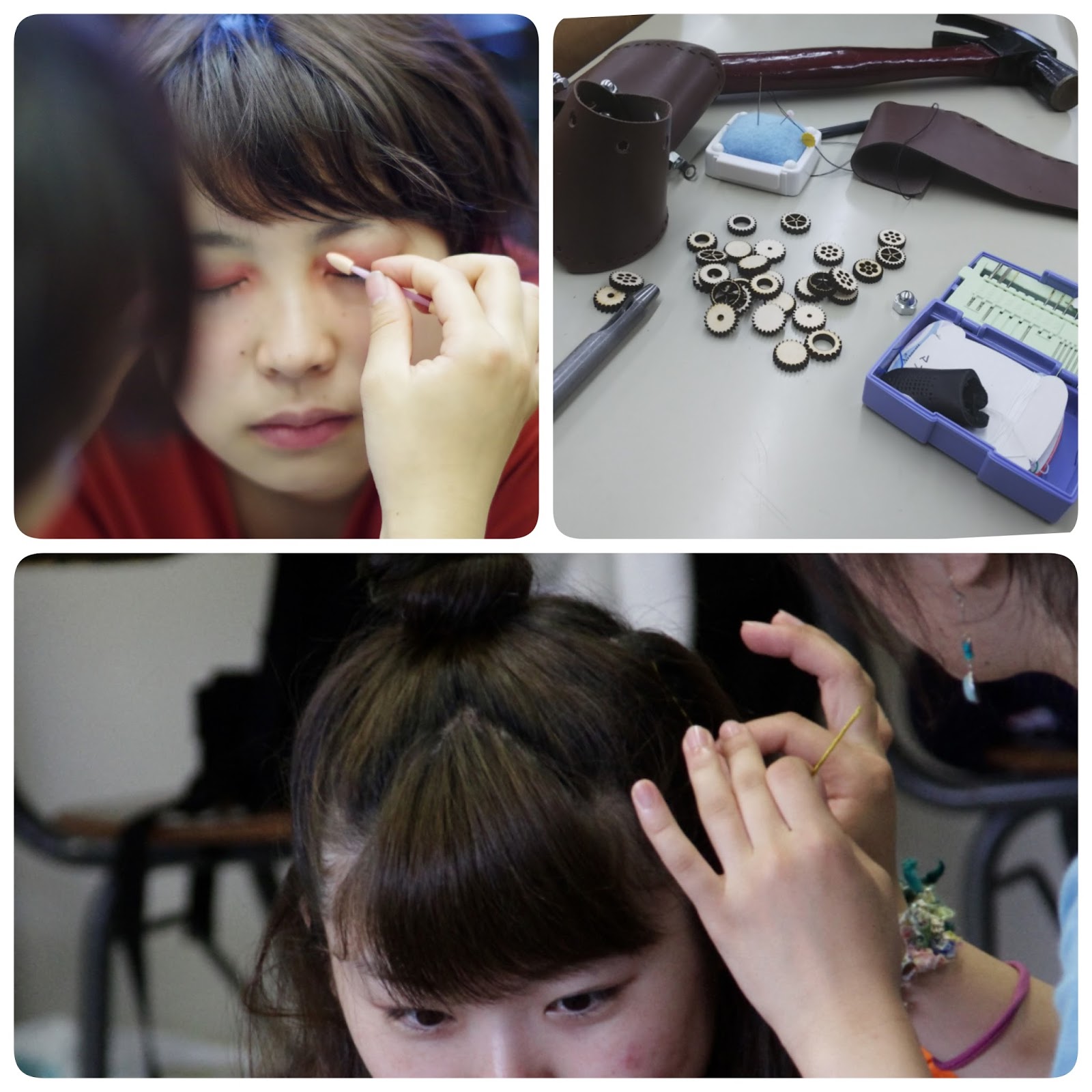 お察しかもしれないけど、その名の通りキャストたちの衣装を考え、探し、時には作り……さっき私は裁縫が苦手だと言ったけど、まあその気になればなんとかなるもんだ。そして、キャストのメイクも考える。(言い忘れていたけどセクション名は正しくは『衣装メイク』だ。)当日キャストたちにメイクをして、髪のセットをして。てんてこ舞いになるのは事実だけど、そうして舞台上にキャストを送り出してみるとなんとも嬉しいもんだ。「あ、私がやったメイク、衣装めっちゃかわいい!!」この瞬間が何より楽しい。